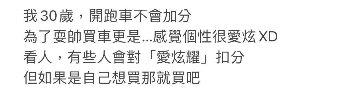 31F→owo0204: 車跟人也要有一致性==女性會看中跑車後面是因為反映你的11/27 11:05