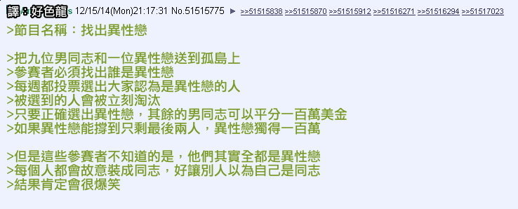 17F推ferretwind: 加一條:被逐出的人如果是gay就可以拿到1/20的獎金 11/25 07:48